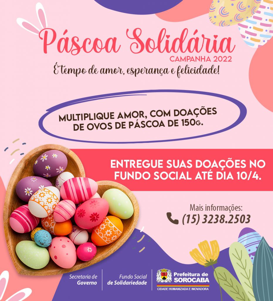 A Prefeitura de Sorocaba, por meio do Fundo Social de Solidariedade (FSS) e da Secretaria de Governo (Segov), lança uma grande campanha de Páscoa na cidade. Ovos de Páscoa de 150g e caixas de chocolate já estão sendo arrecadados, para serem doados a crianças em situação de vulnerabilidade social no município ou que estejam abrigadas em instituições.