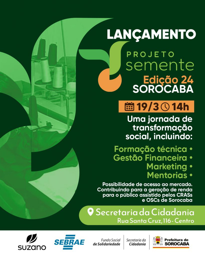 O Projeto Semente visa promover uma jornada de transformação social, oferecendo aos participantes formação técnica, conhecimento em gestão financeira, projeto de marketing, mentorias e possibilidades de acesso ao mercado. Dessa forma, o objetivo é contribuir para a geração de renda para o público assistido pelos Centros de Referência em Assistência Social (CRASs) e pelas Organizações da Sociedade Civil (OSC) de Sorocaba.