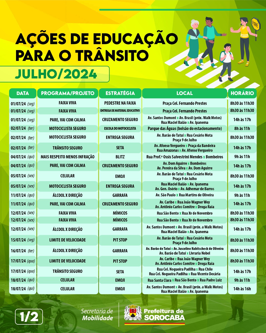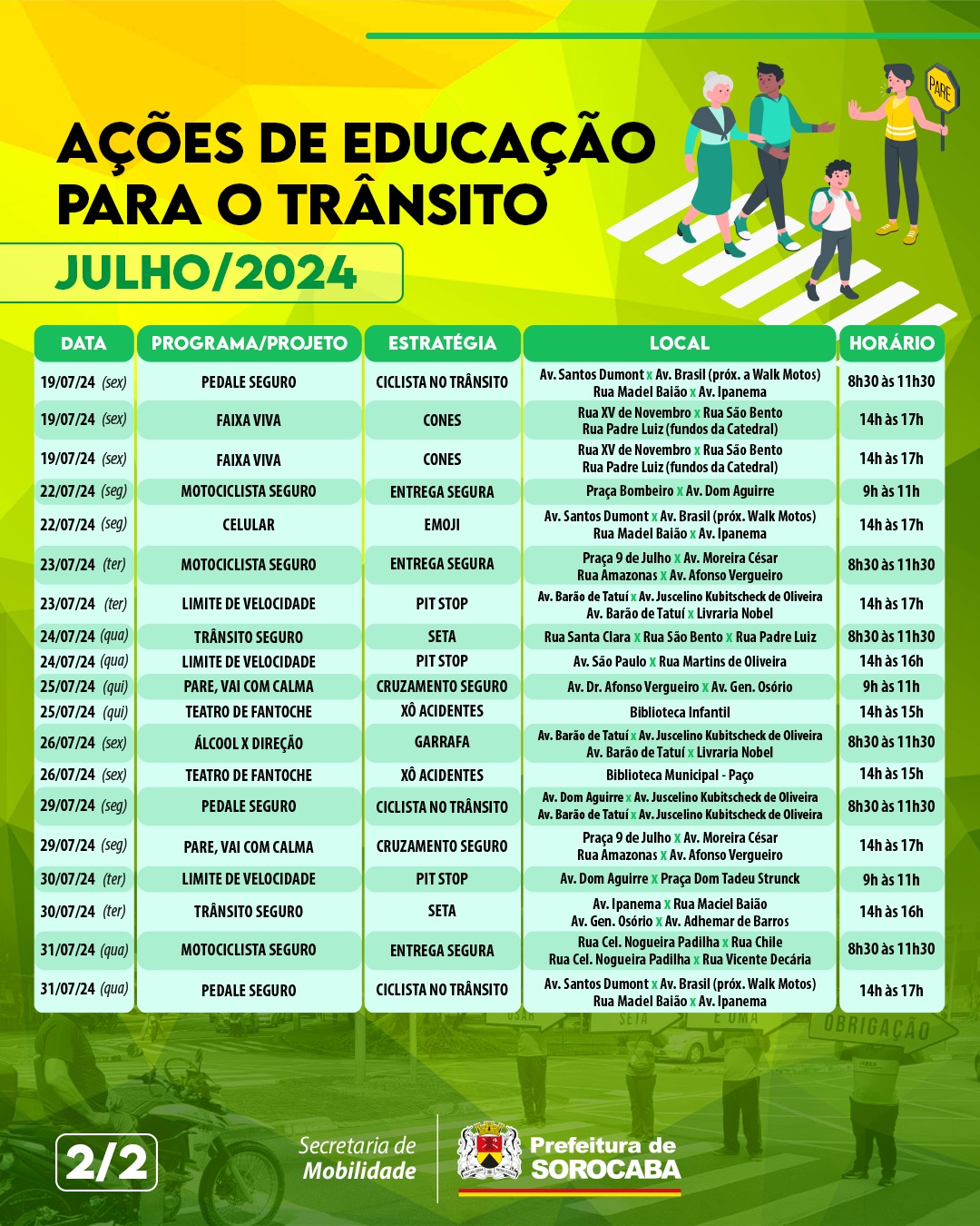 A Prefeitura de Sorocaba, por meio da Secretaria de Mobilidade (Semob), definiu um calendário contendo 40 ações educativas de trânsito para serem realizadas ao longo do mês de julho, todas elas gratuitas. Elas serão diárias e começam na segunda-feira (1), prosseguindo até o dia 31 do mês. Devido ao período de férias, as ações nas escolas serão substituídas por encenações e blitze educativas nos principais cruzamentos viários da cidade.