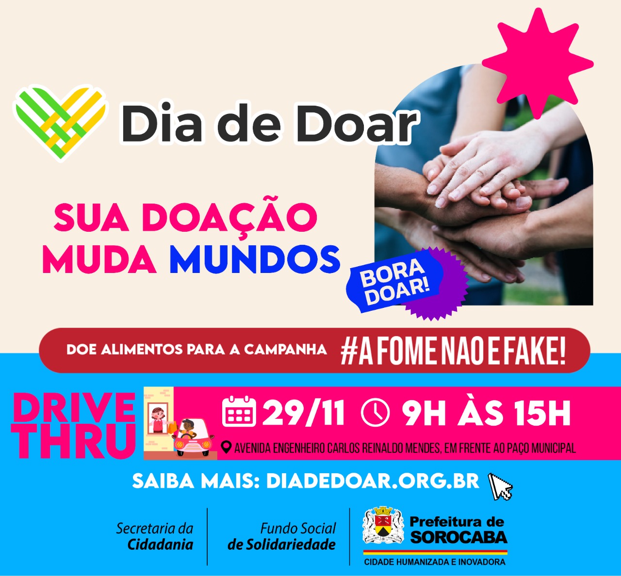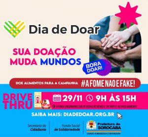 A Prefeitura de Sorocaba, por meio da campanha #AFOMENAOEFAKE! do Fundo Social de Solidariedade (FSS), vai mobilizar a população sorocabana, no próximo dia 29 de novembro, uma terça-feira, ao promover um grande drive-thru solidário no #DiadeDoar.