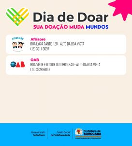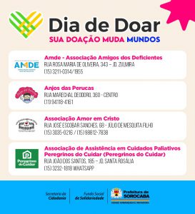 O Drive-Thru #AFOMENAOEFAKE! do #DiadeDoar acontece na Avenida Engenheiro Carlos Reinaldo Mendes, em frente ao Paço Municipal, sentido Centro, no período das 9h às 15h. Todos os munícipes podem participar, bem como grupos de pessoas e empresas, levando quantos quilos de alimentos puderem entregar e registrando esse momento com a hashtag #DiadeDoarSorocaba nas suas redes sociais, para incentivar a participação de outras pessoas e organizações neste movimento de solidariedade. Os alimentos arrecadados serão distribuídos pela Secretaria da Cidadania (Secid) às famílias em situação de vulnerabilidade no município.