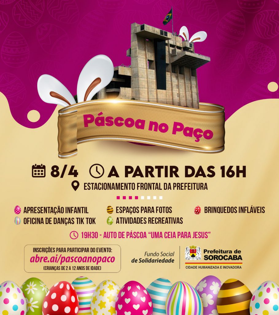 A Prefeitura de Sorocaba, por meio do Fundo Social de Solidariedade (FSS), com apoio da Secretaria de Governo (Segov) e Secretaria de Comunicação (Secom), está preparando uma grande festa para a celebração da Páscoa na cidade. O evento acontecerá no dia 8 de abril, a partir das 16h, no estacionamento frontal do Paço Municipal. A entrada é gratuita e aberta à população.