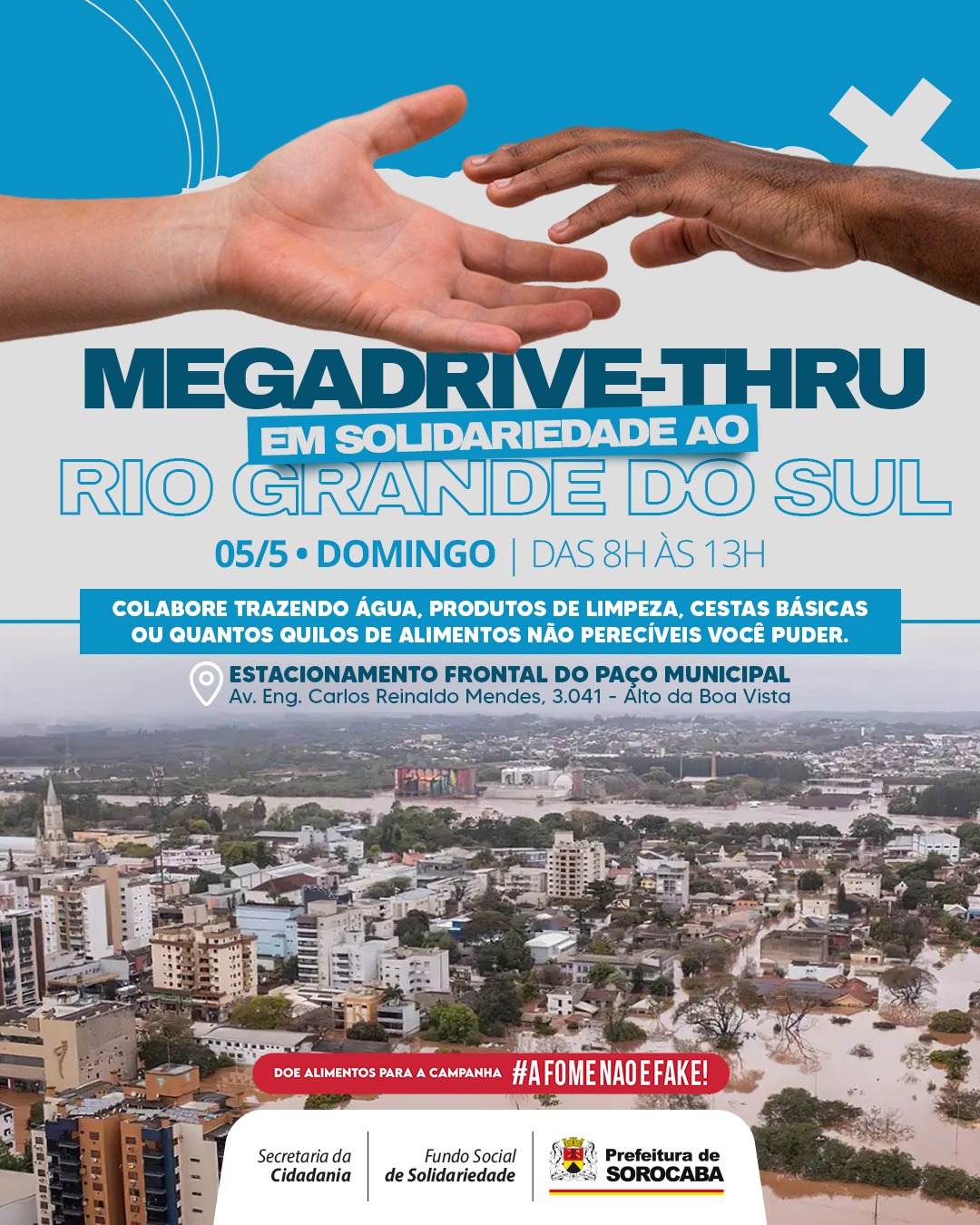 Prefeitura de Sorocaba promove o Megadrive-thru “A Fome não é Fake! – Socorro ao Rio Grande do Sul” neste domingo (5) no Paço Municipal