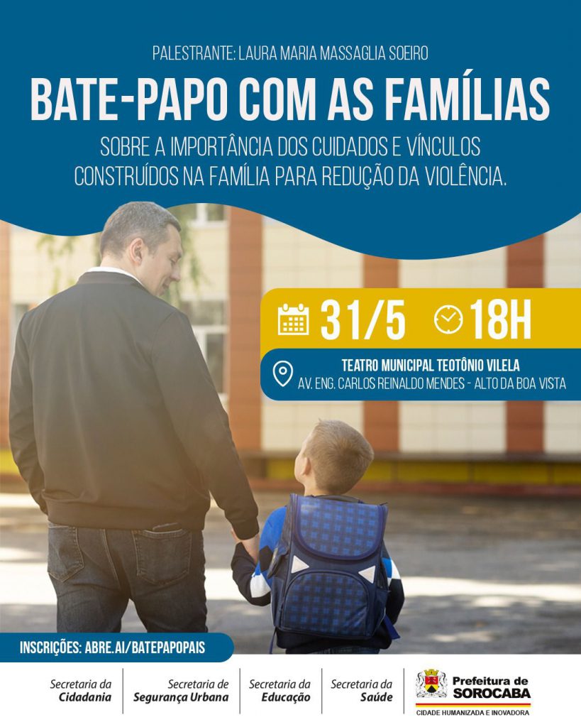 Em mais uma ação oriunda das medidas tomadas em conjunto pelas Prefeituras da Região Metropolitana de Sorocaba (RMS), com a criação de uma cartilha de segurança e outras ações emergenciais para implantação nas escolas públicas (municipais e estaduais) e particulares, a Prefeitura de Sorocaba, que conta, desde então, com o Comitê de Crise de Relações Interpessoais e Combate à Violência Escolar, realizará para toda a população, no dia 31 de maio, às 18h, no Teatro Municipal “Teotônio Vilela”, uma palestra sobre cuidado e vínculo familiar para promoção da segurança nas escolas e outros ambientes, com a psiquiatra Laura Massaglia Soeiro.
