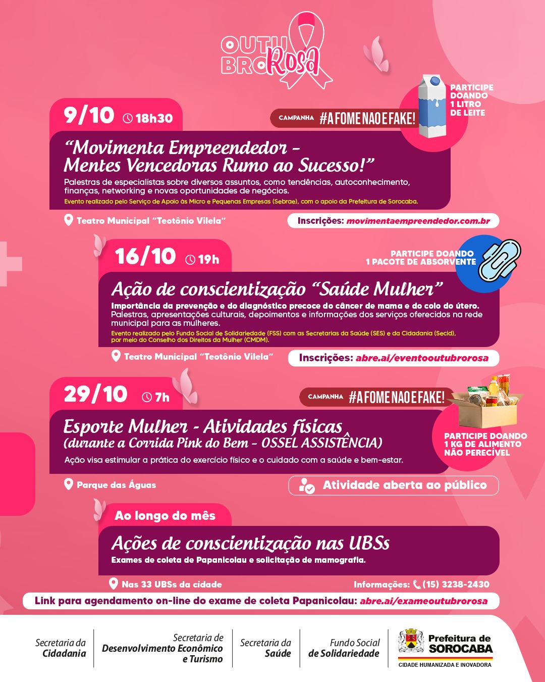 A programação segue no dia 29 de outubro, a partir das 7h, no Parque das Águas, com a Corrida Pink do Bem – OSSEL ASSISTÊNCIA, com o apoio da Secretaria de Esporte e Qualidade de Vida (Sequav) e do Fundo Social de Solidariedade, com atividades que visam estimular a prática do exercício físico e o cuidado com a saúde e bem-estar. O FSS participará por meio do “Esporte Mulher”, grupo que promove atividades físicas às mulheres em eventos esportivos. Durante a retirada do kit após inscrição feita para a corrida, os participantes poderão doar 1 kg de alimento não perecível, que será destinado à campanha “A Fome não é Fake!”, do FSS de Sorocaba
