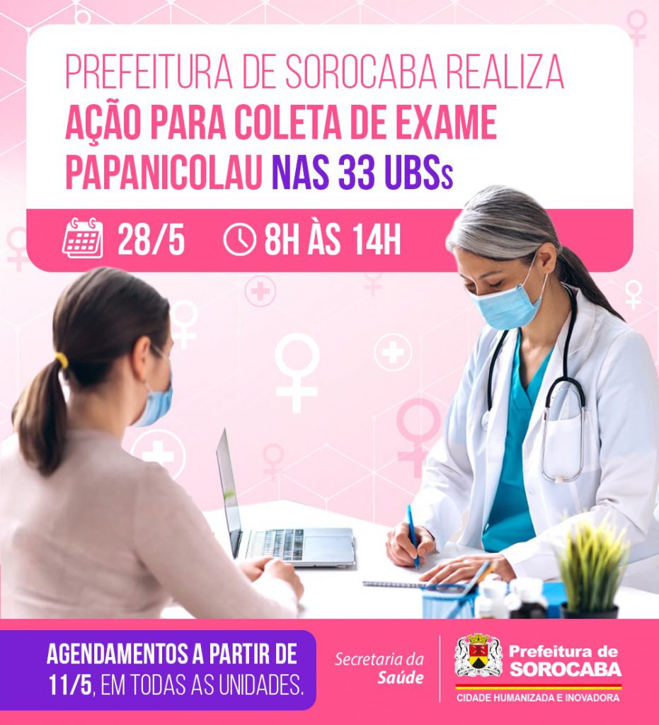 A Prefeitura de Sorocaba, por meio da Secretaria da Saúde, realiza, no dia 28 de maio (sábado), das 8h às 14h, nas 33 UBSs da cidade, uma ação para a realização de exames Papanicolau, que é feito para detectar possíveis alterações nas células do colo do útero da mulher.