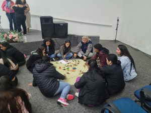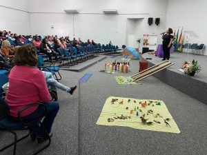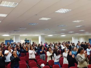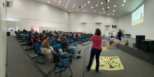No caso da formação com foco nos estagiários, ela abrangeu vários temas, entre eles o painel denominado “Brincarolices”, apresentado pela mestranda em Educação e professora de Educação Básica (PEB I), Leila Chinelatto, que resume a proposta: “Brincarolices consiste em despertar e brincar com a nossa criança interior”. Com essa pauta, Leila levou os estagiários a se movimentarem cantando, dançando e ampliando seu repertório de dinâmicas e outras atividades lúdicas a serem desenvolvidas com as crianças.