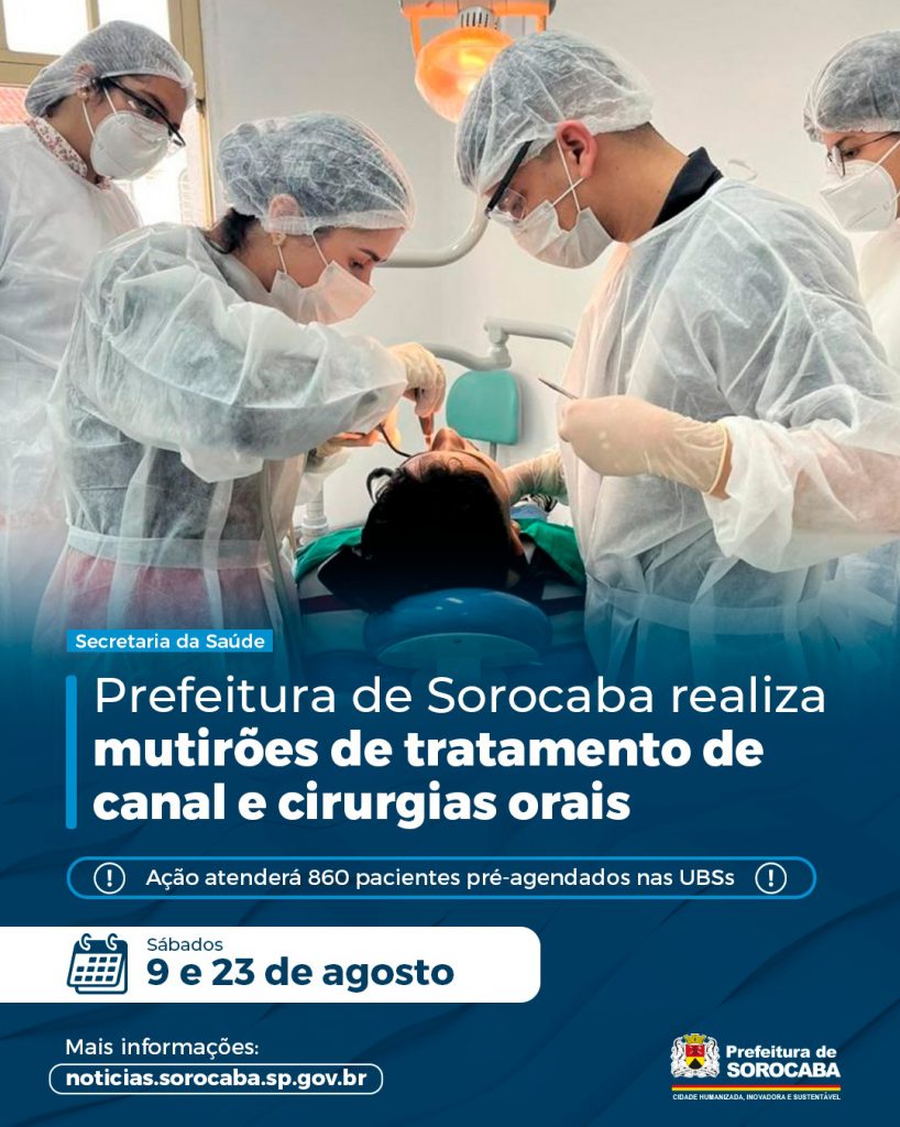 A Prefeitura de Sorocaba, por meio da Coordenação de Saúde Bucal, vinculada à Secretaria da Saúde (SES), realizará, nos próximos sábados, dias 9 e 23 de agosto, dois mutirões odontológicos com foco na realização de tratamentos de canal (endodontia) e cirurgias orais.