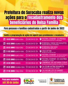 A Prefeitura de Sorocaba, por meio de ações realizadas pelos CRASs (Centros de Referência em Assistência Social), ligados à Secretaria da Cidadania (Secid), seguem oferecendo aos moradores de Sorocaba auxílio para o recadastramento necessário àqueles que têm direito ao recebimento do programa federal Bolsa Família.