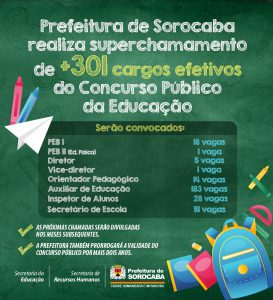 A Prefeitura de Sorocaba, por meio das Secretarias de Recursos Humanos (SERH) e da Educação (Sedu), publica, nesta sexta-feira (6), no Jornal do Município, um superchamamento de mais 301 vagas do Concurso Público da Educação para atuação em oito diferentes cargos efetivos na Rede Municipal de Ensino.