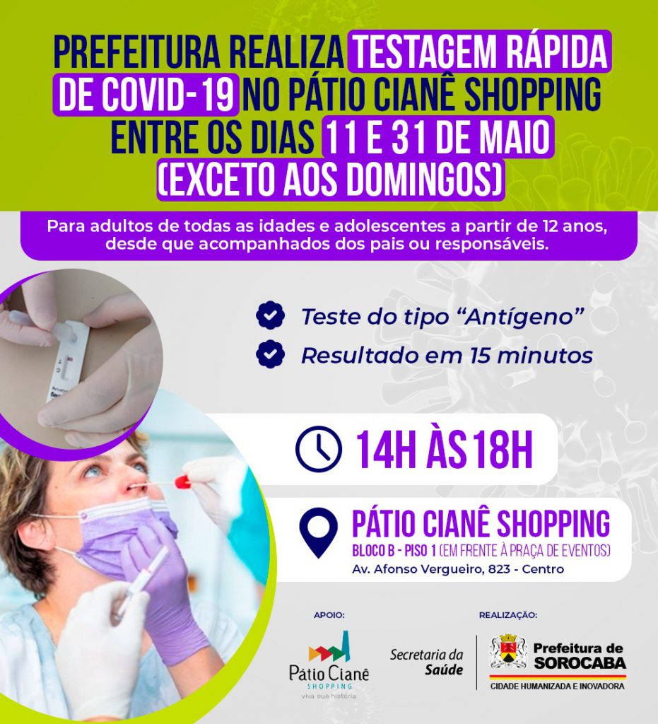 A Prefeitura de Sorocaba, por meio da Secretaria da Saúde (SES), realiza, entre os dias 11 e 31 de maio, com exceção dos domingos (15, 22 e 29/5), nova ação de testagem rápida de Covid-19 no Pátio Cianê Shopping, no Bloco B, Piso 1, em frente à Praça de Eventos. Os testes gratuitos serão realizados das 14h às 18h, de segunda a sexta-feira, e aos sábados, das 12h às 18h. O objetivo da iniciativa é verificar a circulação viral.