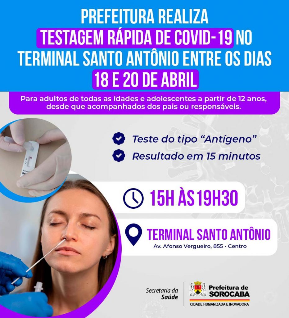 A Prefeitura de Sorocaba, por meio da Secretaria da Saúde (SES), realiza, na próxima semana, entre os dias 18 e 20 de abril, uma nova ação de testagem rápida de Covid-19. Desta vez, a iniciativa ocorrerá no Terminal Santo Antônio. Os testes gratuitos serão feitos das 15h às 19h30 e o objetivo é verificar a circulação viral.