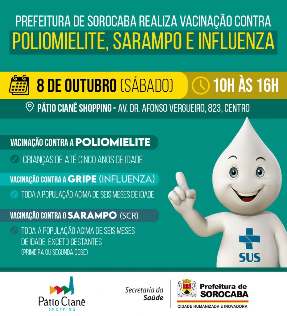 A Prefeitura de Sorocaba, por meio da Secretaria da Saúde (SES), realiza, neste sábado (8), das 10h às 16h, ação de vacinação contra Poliomielite, Gripe (Influenza) e Sarampo no Pátio Cianê Shopping.