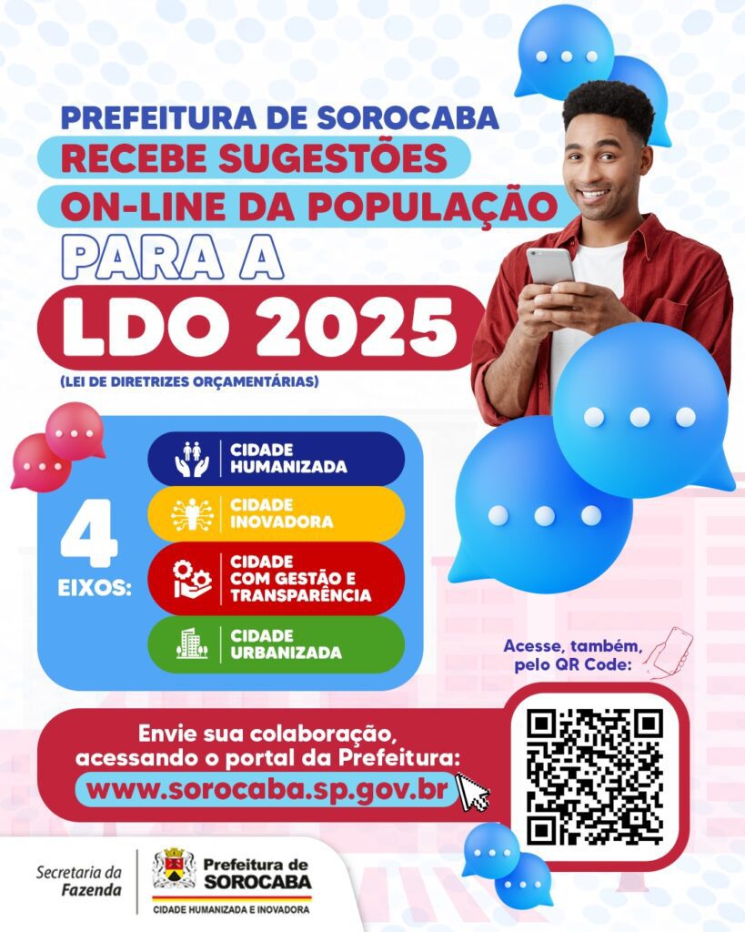 A Prefeitura de Sorocaba, por meio da Secretaria da Fazenda (Sefaz) e do Gabinete Central, abrem, nesta quinta-feira (1), o prazo para recebimento on-line de sugestões da população que podem ser incluídas no projeto da Lei de Diretrizes Orçamentárias (LDO) 2025. A proposta é elaborada anualmente e estabelece as metas e prioridades para a Lei Orçamentária Anual (LOA). O prazo de participação prossegue até o dia 1 de março (sexta-feira).