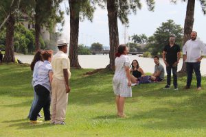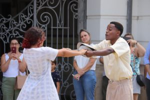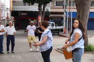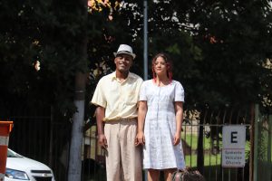 A primeira peça teatral apresentada durante o percurso aconteceu em frente à antiga Estação Ferroviária da cidade. A história mostrou os personagens Lena e João, que chegam a Sorocaba em busca de trabalho e moradia, por meio da Estrada de Ferro Sorocabana. Já, na segunda parada, na Praça Cel. Fernando Prestes, o grupo encenou o protesto feito pelos jovens, na década de 1970, sobre a proibição do beijo em público na cidade, conhecido como “A Noite do Beijo”.