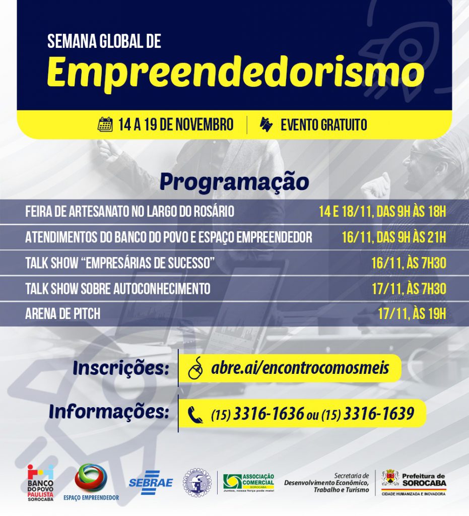 A Prefeitura de Sorocaba, por meio da Secretaria de Desenvolvimento Econômico, Trabalho e Turismo (Sedettur), o Sebrae (Serviço Brasileiro de Apoio às Micro e Pequenas Empresas) e a ACSO (Associação Comercial de Sorocaba) realizarão, gratuitamente, de 14 a 19 de novembro, a Semana Global do Empreendedorismo.