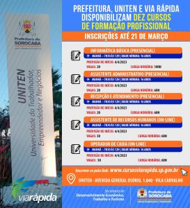 A Prefeitura de Sorocaba, por meio da Universidade do Trabalhador, Empreendedor e Negócios (Uniten), ligada à Secretaria Municipal de Desenvolvimento Econômico, Trabalho e Turismo (Sedettur), em parceria com o Programa Via Rápida Cursos, da Secretaria de Desenvolvimento Econômico, Ciência, Tecnologia e Inovação do Governo do Estado de São Paulo, está com inscrições abertas para quatro cursos presenciais e seis cursos on-line de qualificação profissional.