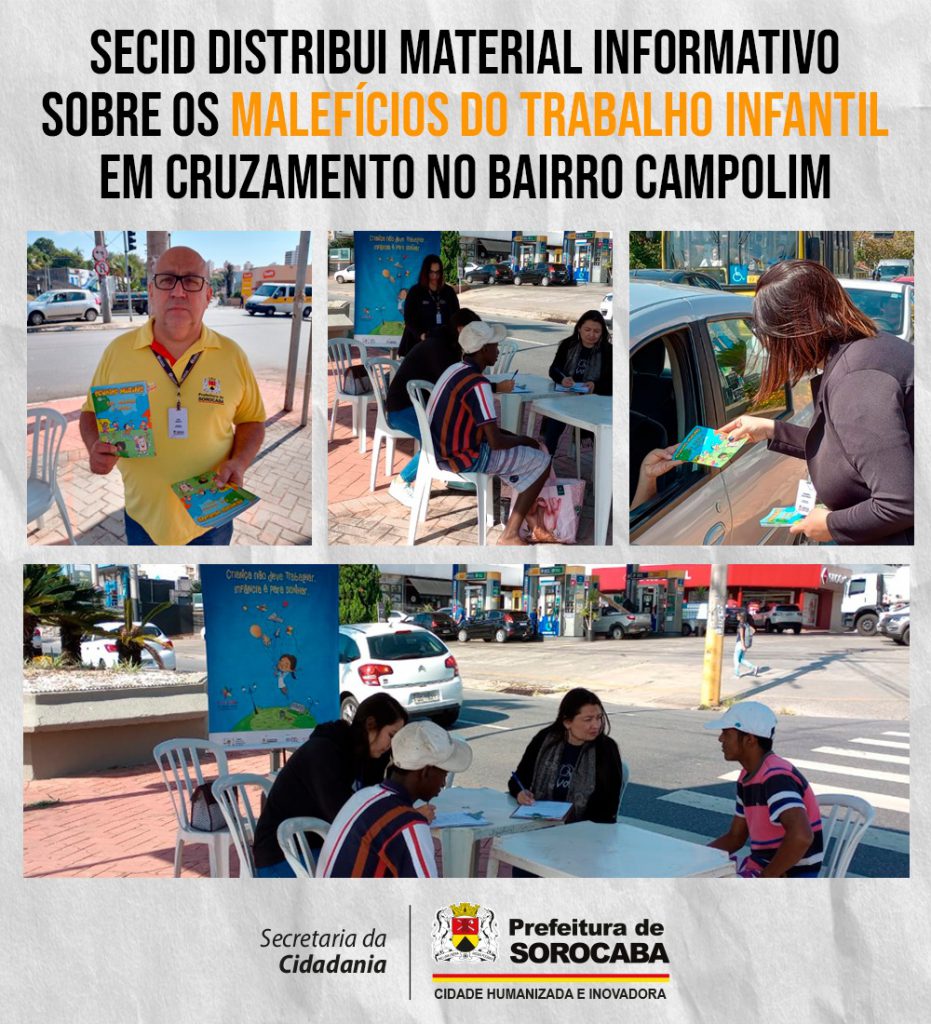 A Prefeitura de Sorocaba, por meio da Secretaria da Cidadania (Secid), realizou uma ação especial nesta quarta-feira (20), com a distribuição de uma cartilha esclarecedora sobre questões relacionadas ao trabalho infantil. O material, em forma de gibi com os personagens principais da “Turma da Mônica”, tem linguagem clara é atraente, tanto para o público infanto-juvenil, bem como para os pais ou responsáveis, e traz a chancela do Tribunal Superior do Trabalho e do Conselho Superior da Justiça do Trabalho.