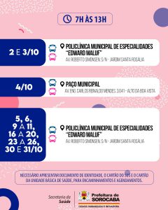 Nos dias 2, 3, 5, 6, 9, 10, 11, 16, 17, 18, 19, 20, 23, 24, 25, 26, 30 e 31, os ônibus estarão na Policlínica Municipal de Especialidades “Edward Maluf”, localizada na Avenida Roberto Simonsen, s/n, no Jardim Santa Rosália.