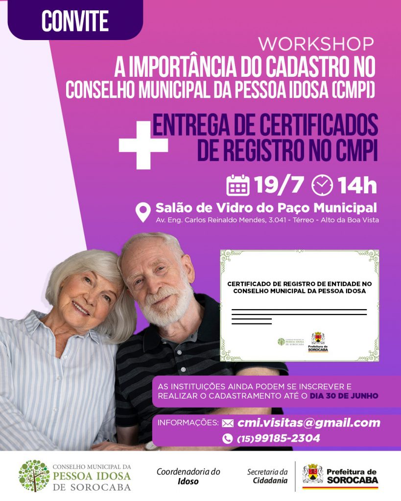 A Secretaria da Cidadania (Secid), por meio da sua Coordenadoria da Pessoa Idosa, e o Conselho Municipal da Pessoa Idosa (CMPI) farão a entrega dos certificados das instituições de longa permanência e outras que atendem o público idoso, no próximo dia 19 de julho, às 14h, no Salão de Vidro do Paço Municipal. Haverá também, nessa data, um workshop aberto aos interessados, com o tema: “A importância do cadastramento no Conselho”.