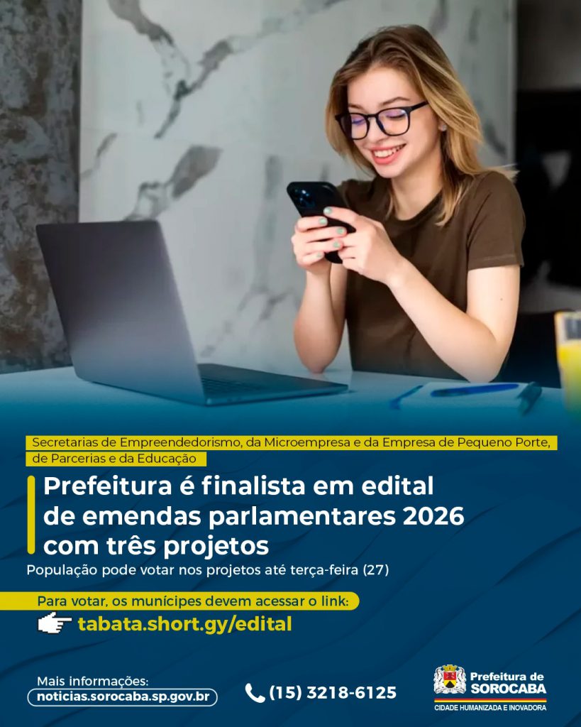 A Prefeitura de Sorocaba, por meio das Secretarias de Empreendedorismo, da Microempresa e da Empresa de Pequeno Porte (Semepp) e de Parcerias (Separ) é finalista no Edital de emendas parlamentares 2026, de deputada federal, com dois projetos destinados aos empreendedores da cidade. A população pode votar nos projetos até terça-feira (27).