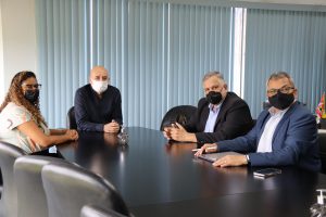 O vice-prefeito Fernando Martins da Costa Neto, o secretário de Planejamento (Seplan), Paulo Henrique Marcelo, e a responsável pelo Centro de Aceleração Desenvolvimento e Inovação (CADI) e coordenadora da Unidade de Execução e Programa (UEP) da Prefeitura, Jessica Pedrosa, receberam a visita do representante do Fonplata no Brasil, Óscar Carvalho, e o consultor do Fundo no município, Joabe Azevedo, nesta quinta-feira (2), no Paço Municipal.
