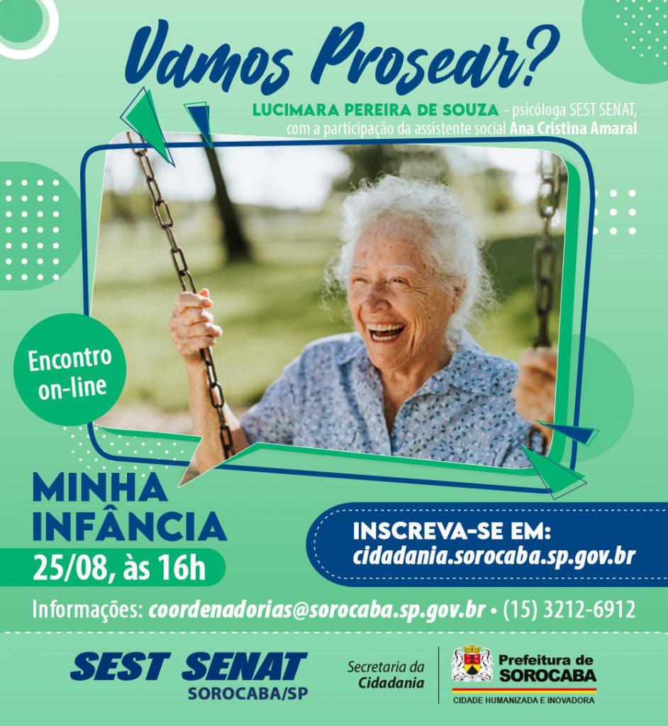 Será o segundo encontro nesse formato promovido pelo SEST SENAT (Serviço Social do Transporte e Serviço Nacional de Aprendizagem do Transporte) Sorocaba, com o apoio da Prefeitura de Sorocaba, por meio da Secretaria da Cidadania (Secid) e sua Coordenadoria do Idoso. A temática, desta vez, será “Minha Infância”, com bate-papo conduzido pela psicóloga do SEST SENAT, Lucimara Pereira de Souza, permitindo que cada participante interaja e dê seu depoimento. Nesta edição, haverá a participação especial da assistente social Ana Cristina Amaral.