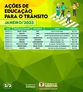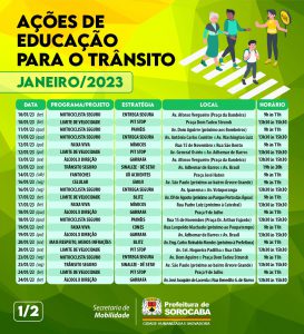 A Prefeitura de Sorocaba, por meio da Secretaria de Mobilidade (Semob), definiu um calendário com 32 ações educativas de trânsito para iniciar 2023. As atividades, totalmente gratuitas e voltadas ao público em geral, vão ocorrer em pontos estratégicos da cidade, entre os dias 10 e 31 de janeiro.