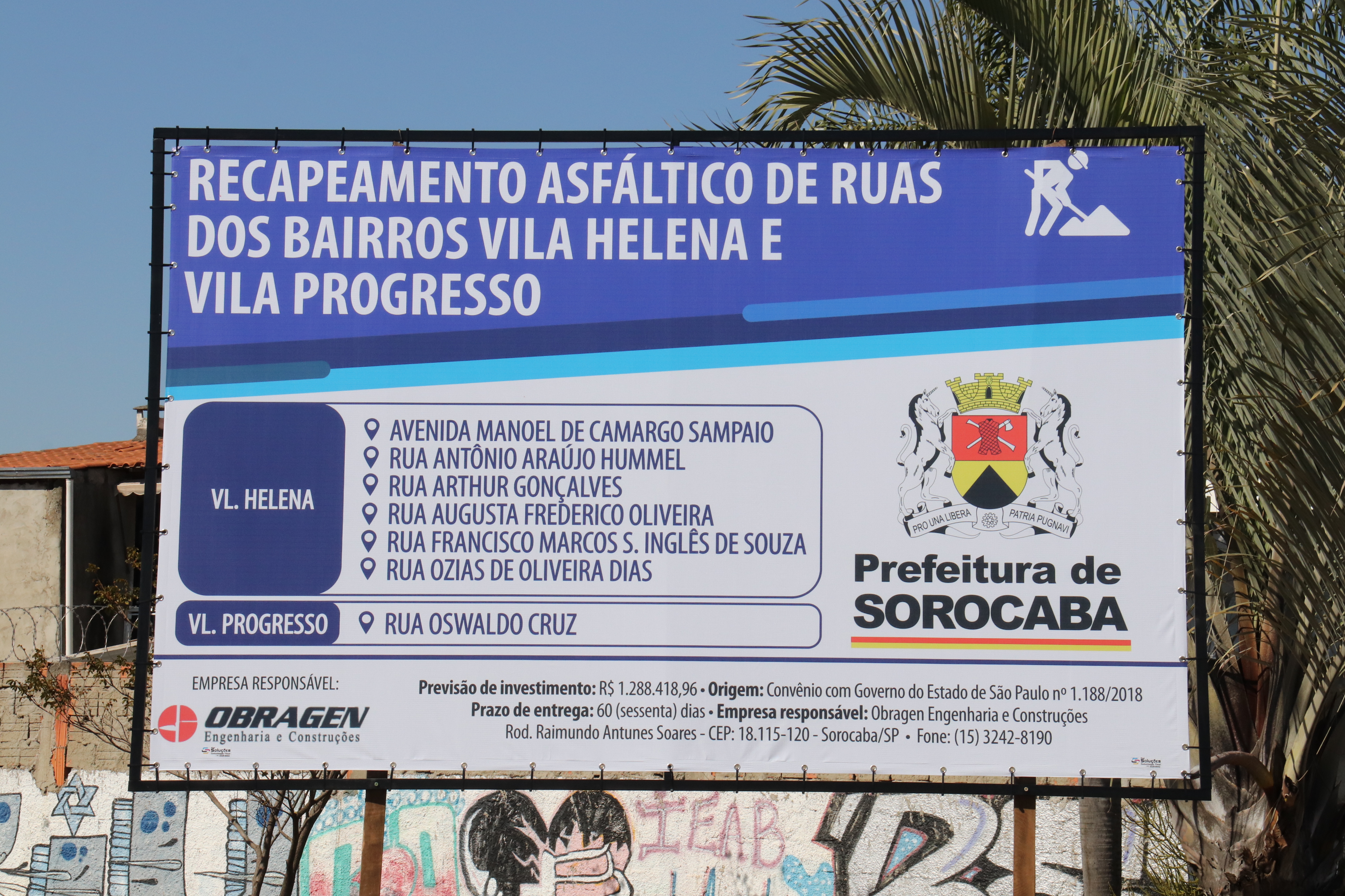 A Prefeitura de Sorocaba, por meio da Secretaria de Serviços Públicos e Obras (Serpo), iniciou, nesta quarta-feira (21), obras de recapeamento asfáltico em ruas da Vila Helena e Vila Progresso.