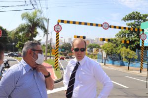 Na ocasião, o prefeito esteve acompanhado dos secretários municipais Carlos Eduardo Paschoini (Mobilidade – Semob) e Darwin de Almeida Rosa (Serviços Públicos e Obras – Serpo), além do diretor-presidente da Urbes – Trânsito e Transportes, Sérgio Barreto. “Parte do dispositivo é móvel e serve de alerta extra ao motorista, cujo veículo, com excesso de altura, esbarra no delimitador”, explica Paschoini.