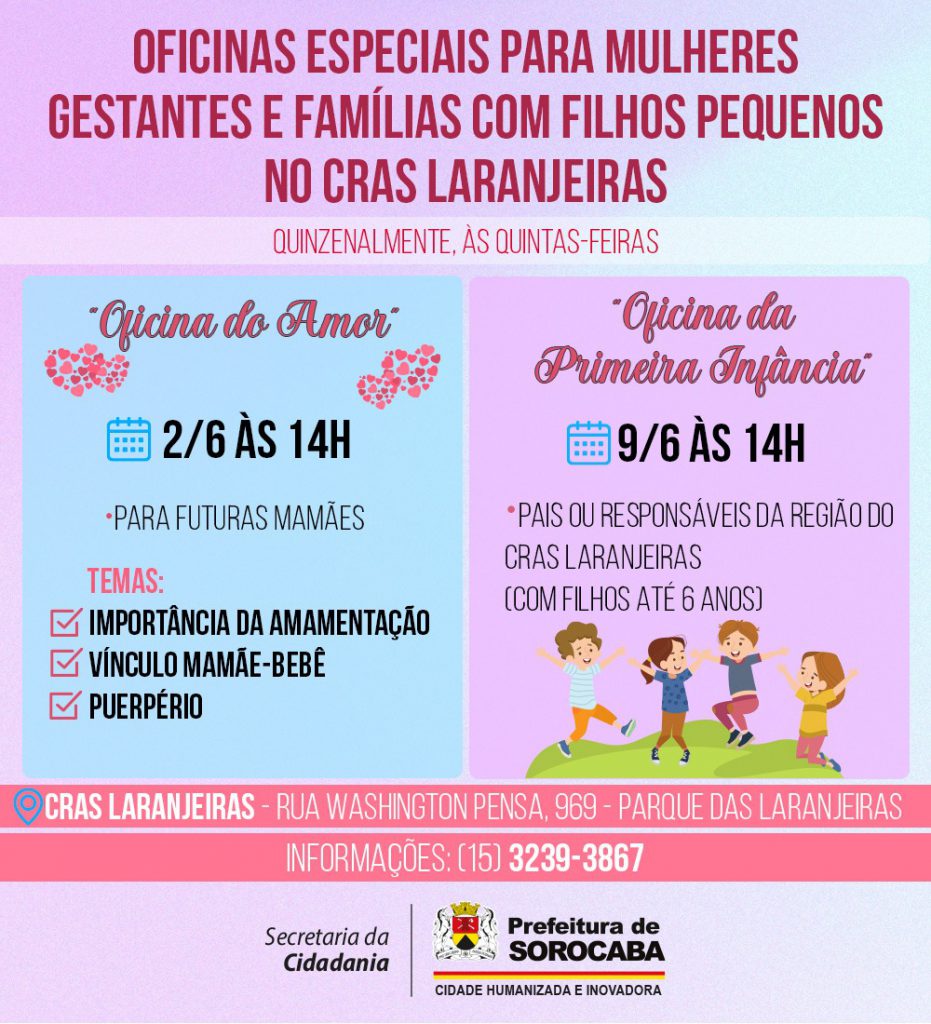 Essas ações são promovidas pela Prefeitura de Sorocaba, por meio da Secretaria da Cidadania (Secid), responsável pela administração da rede CRAS. O CRAS Laranjeiras fica na Rua Washington Pensa, 969, no Parque das Laranjeiras. O telefone para mais informações é: (15) 3239-3867.