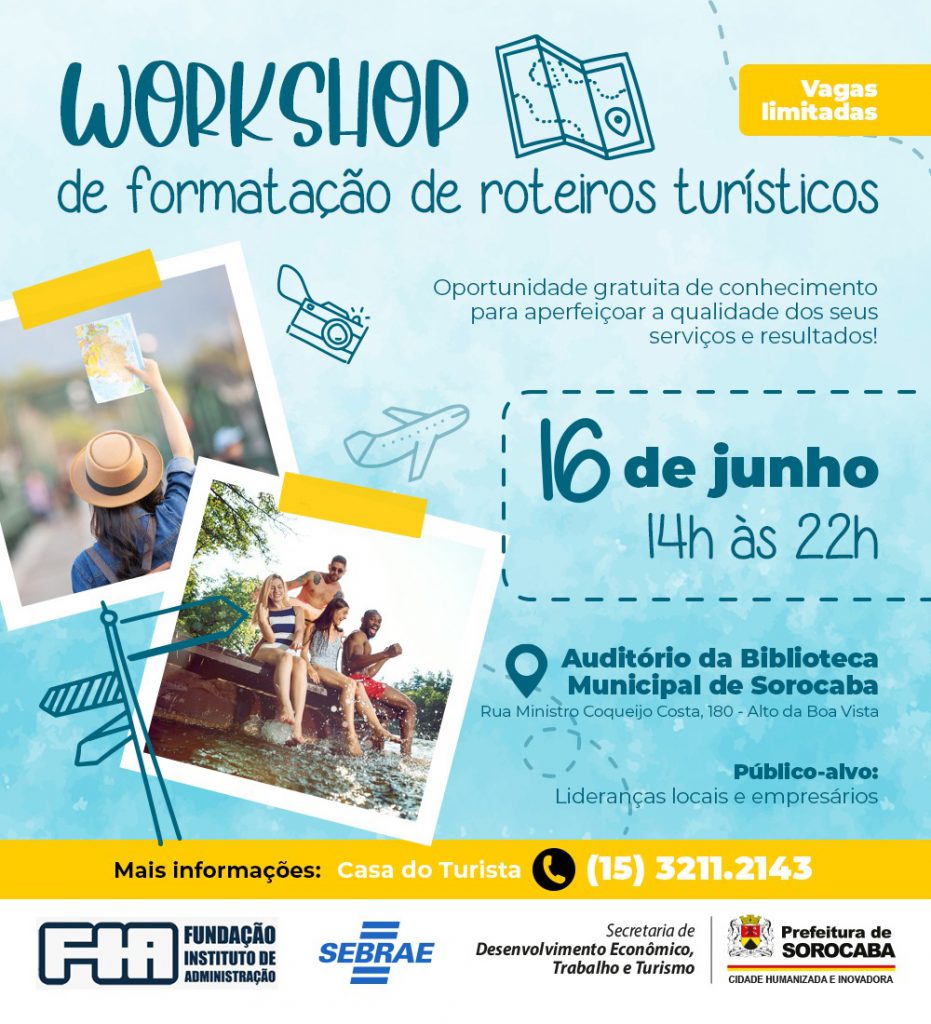A Prefeitura de Sorocaba, por meio da Secretaria de Desenvolvimento Econômico, Trabalho e Turismo (Sedettur), em parceria com o Serviço Brasileiro de Apoio às Micro e Pequenas Empresas (Sebrae) e a Fundação Instituto de Administração (FIA), promoverá, no dia 16 de junho, a partir das 14h, no auditório da Biblioteca Municipal, um encontro entre o Poder Público e empresários para levantamento de atrativos potenciais e definição de roteiros turísticos possíveis de comercialização por agências e operadoras. A reunião, que será presencial, seguirá todos os protocolos sanitários preventivos à Covid, como distanciamento social, uso de máscara e álcool em gel.