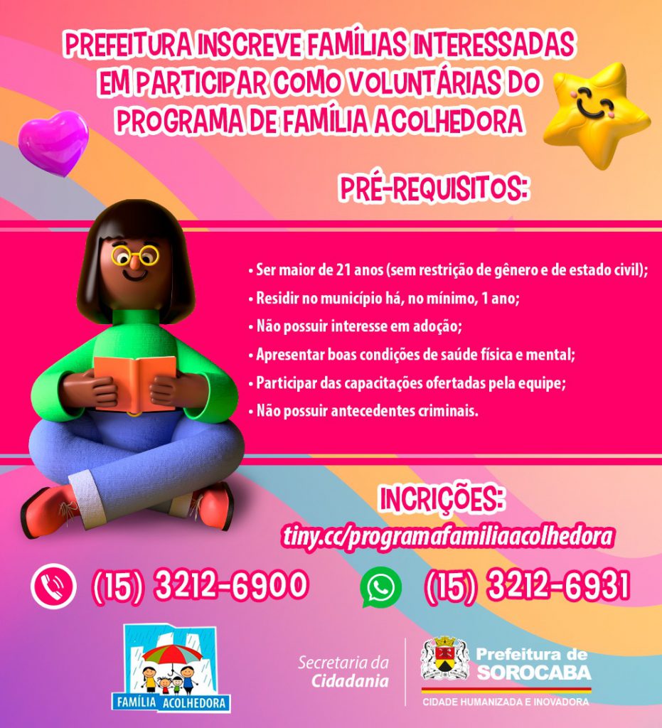 As inscrições para o programa de Família Acolhedora podem ser feitas pelo link: http://tiny.cc/programafamiliaacolhedora. Mais informações podem ser obtidas pelo telefone: (15) 3212-6900.