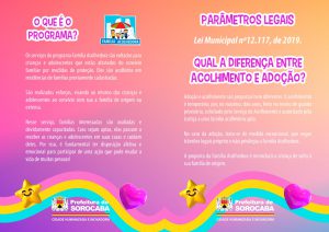 A equipe gestora do programa produziu uma cartilha para ser distribuída à população, com informações necessárias a quem tem o intuito de participar desse projeto. Trata-se de o acolhimento provisório de crianças e adolescentes afastados de suas famílias de origem por ordem judicial.