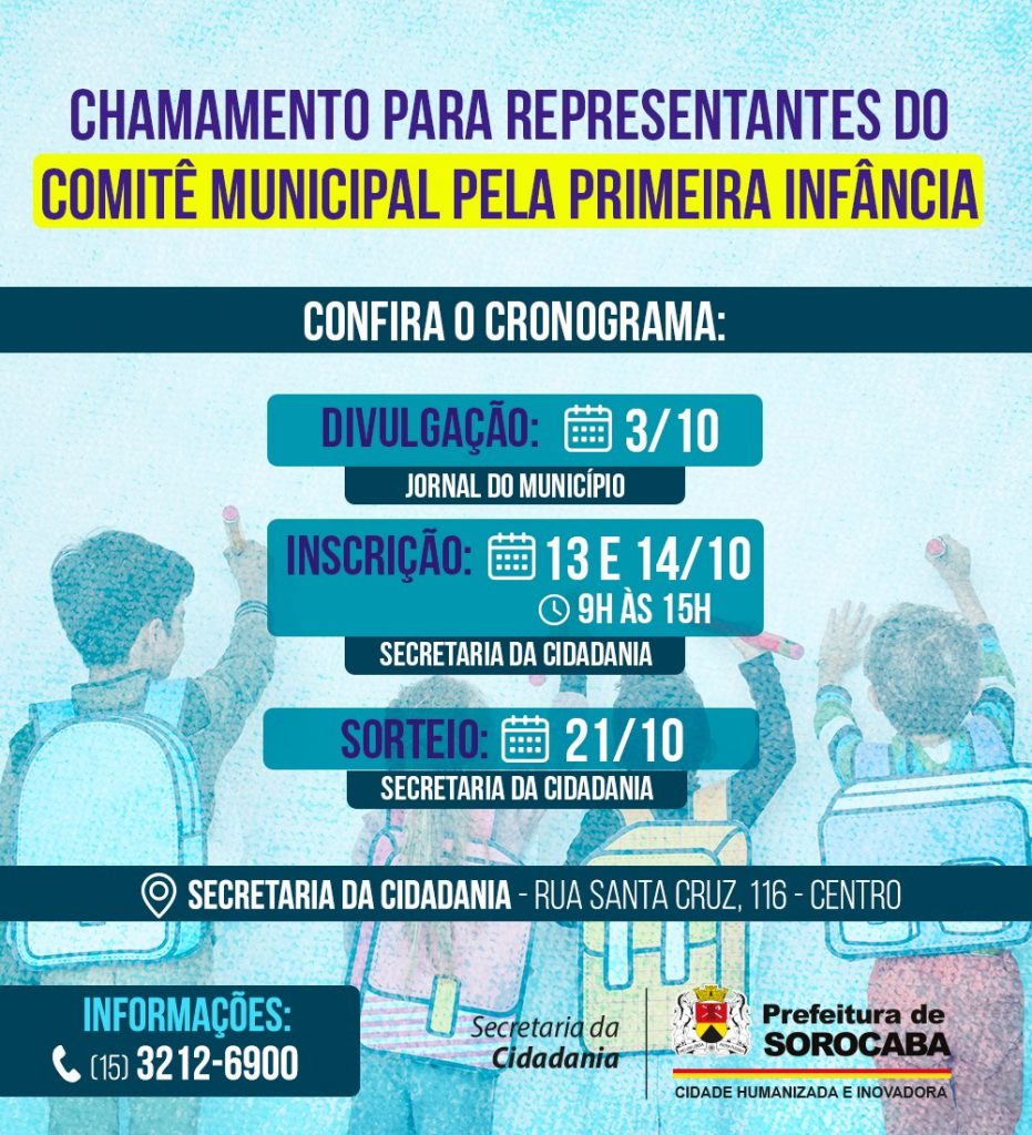 A Prefeitura de Sorocaba, por meio da Secretaria da Cidadania (Secid), publicou, na edição desta segunda-feira (3) do Jornal Município de Sorocaba, o edital de chamamento para representantes interessados em integrar o Comitê Municipal pela Primeira Infância.