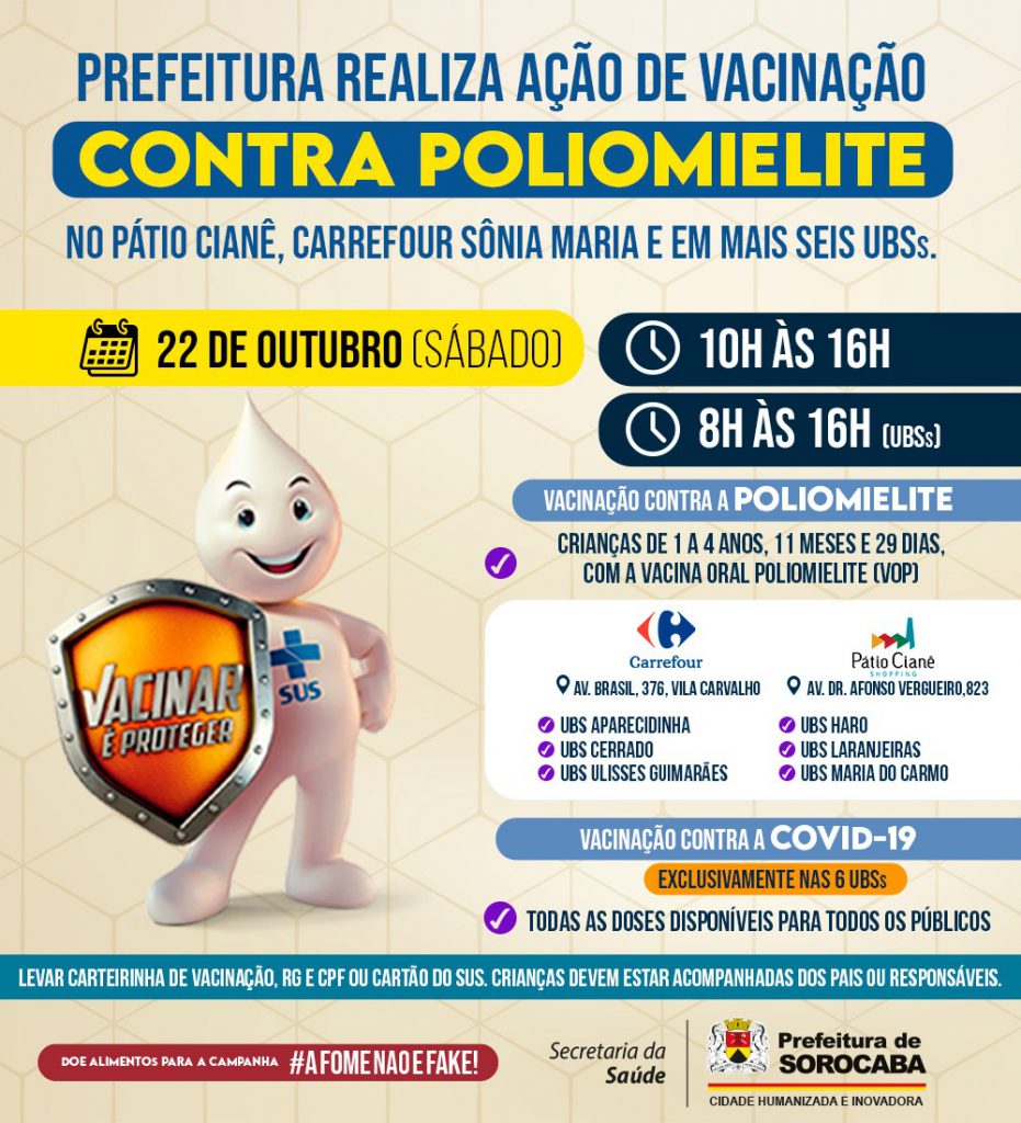 A Prefeitura de Sorocaba, por meio da Secretaria da Saúde (SES), realiza, neste sábado (22), uma ação especial de vacinação contra Poliomielite em oito locais diferentes da cidade.
