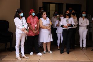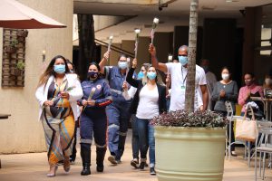 Logo no início do ato, a servidora da Unidade Básica de Saúde (UBS) Laranjeiras, Suelen Cristina, emocionou as pessoas presentes ao interpretar a música “Hallelujah”. Cada unidade de saúde municipal foi representada por um enfermeiro ou técnico de enfermagem durante a celebração.