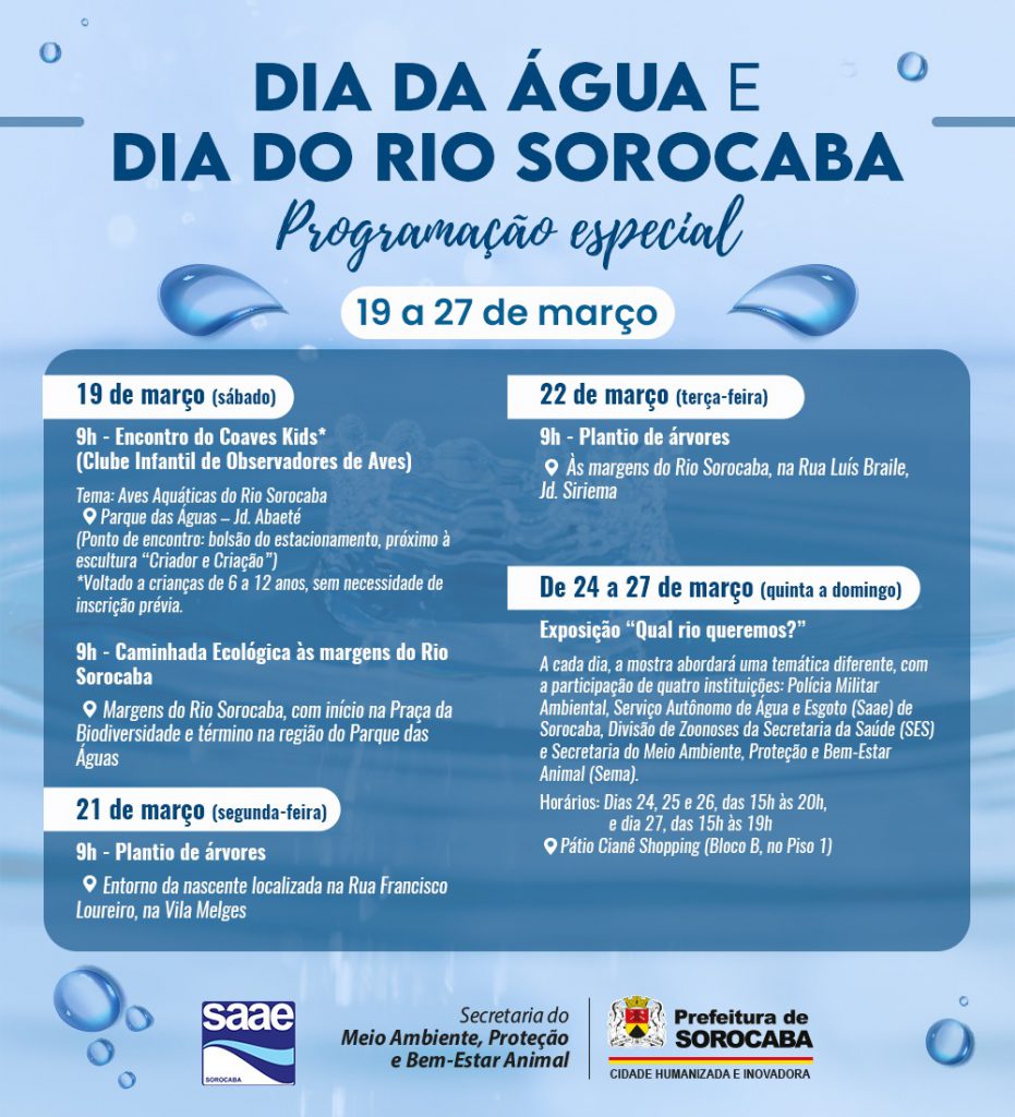 Também como parte da programação especial em celebração dessas datas, a Sema realizou, na manhã desta segunda-feira (21), o plantio de 30 mudas de árvores no entorno da nascente da Vila Melges, com a participação de alunos do Centro de Educação Infantil “Olga Chibau Fornaziero” (CEI-52). Confira a programação completa da Semana da Água e do Rio Sorocaba na arte, abaixo.