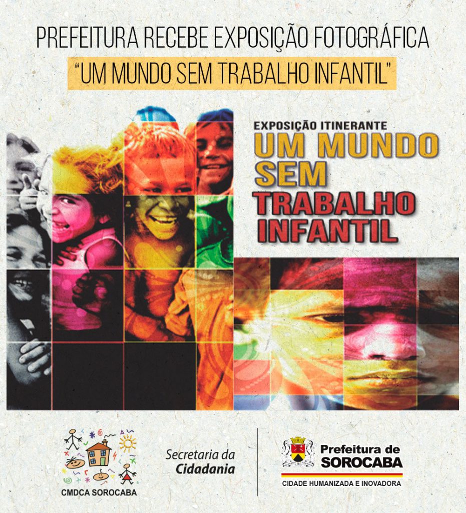 Em referência ao Dia Mundial de Combate ao Trabalho Infantil, celebrado no dia 12 de junho, a Prefeitura de Sorocaba, por meio da Secretaria da Cidadania (Secid), da Coordenadoria da Criança e do Adolescente e do Conselho Municipal dos Direitos da Criança e do Adolescente (CMDCA), traz para o Paço Municipal a exposição fotográfica itinerante “Um Mundo sem Trabalho Infantil”, com imagens ilustrando situações que revelam a problemática da exploração do trabalho de crianças e adolescentes.