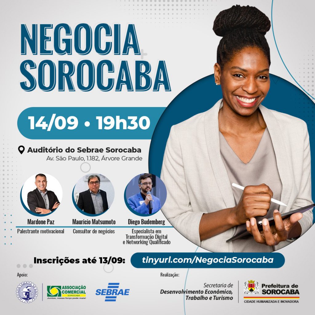 A Prefeitura de Sorocaba, por meio da Secretaria de Desenvolvimento Econômico, Trabalho e Turismo (Sedettur), com o apoio do Serviço Brasileiro de Apoio às Micro e Pequenas Empresas (Sebrae) e da Associação Comercial de Sorocaba (ACSO), realizará, no dia 14 de setembro, às 19h30, o encontro Negocia Sorocaba.