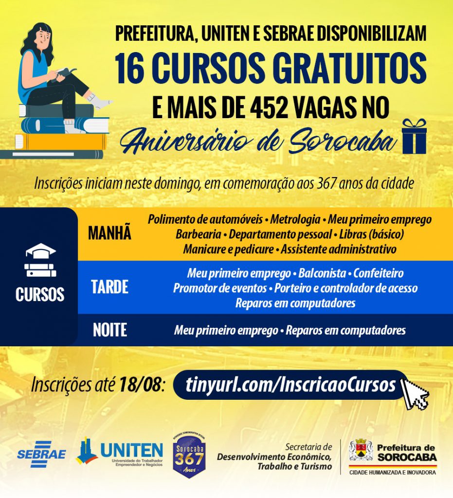 Em comemoração aos 367 anos do Aniversário de Sorocaba, a Prefeitura de Sorocaba, por meio da Universidade do Trabalhador, Empreendedor e Negócios (Uniten), da Secretaria de Desenvolvimento Econômico, Trabalho e Turismo (Sedettur), e o Serviço Brasileiro de Apoio às Micro e Pequenas Empresas (Sebrae) ofertam, a partir deste domingo, dia 15 de agosto, 16 cursos gratuitos de qualificação profissional, com mais de 452 vagas disponíveis.