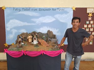 Utilizando madeira, tecido e materiais reciclados, Augusto Torrine criou um cenário com gruta, fonte e lago e, nele, colocou as figuras de Maria, José, menino Jesus, pastor e os Reis Magos.