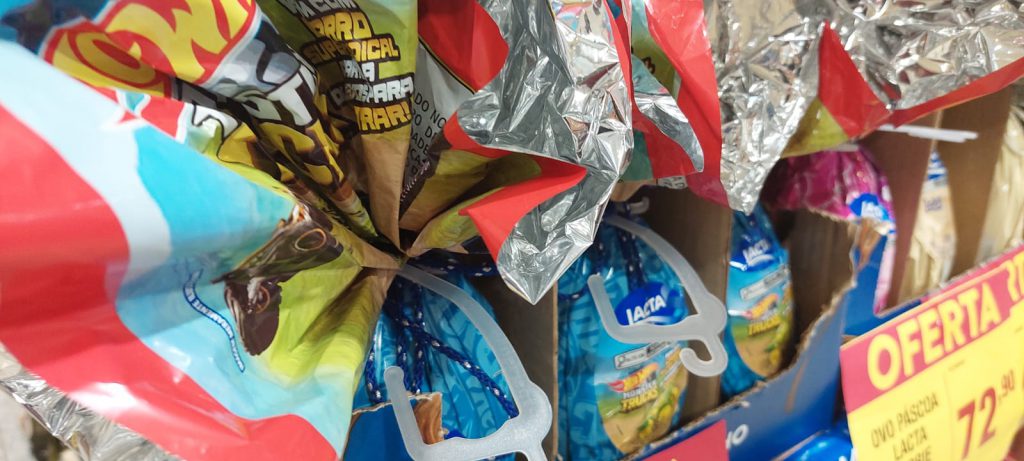 No caso de brinquedos, quando houver acompanhado do chocolate, a embalagem deve apresentar o selo do Instituto Nacional de Metrologia, Qualidade e Tecnologia (Inmetro) e identificação da faixa etária indicada. Se o produto foi importado, deve apresentar informações em língua portuguesa, como: identificação do fabricante/importador, país de origem, prazo de validade, composição, volume/quantidade, registro no órgão competente dentre outras informações obrigatórias.
