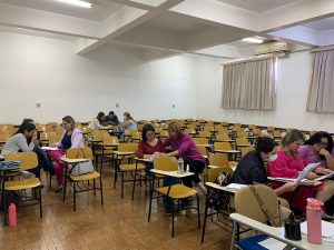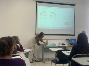 As palestrantes e enfermeiras Isabel C. R. S. Saccomann, Mila S. Oliveira e Priscila R. Dordetto relembraram aos profissionais sobre a importância da consulta de enfermagem como atribuição exclusiva do enfermeiro, revisão da técnica de aferição de pressão arterial, exame físico e indicadores de saúde.