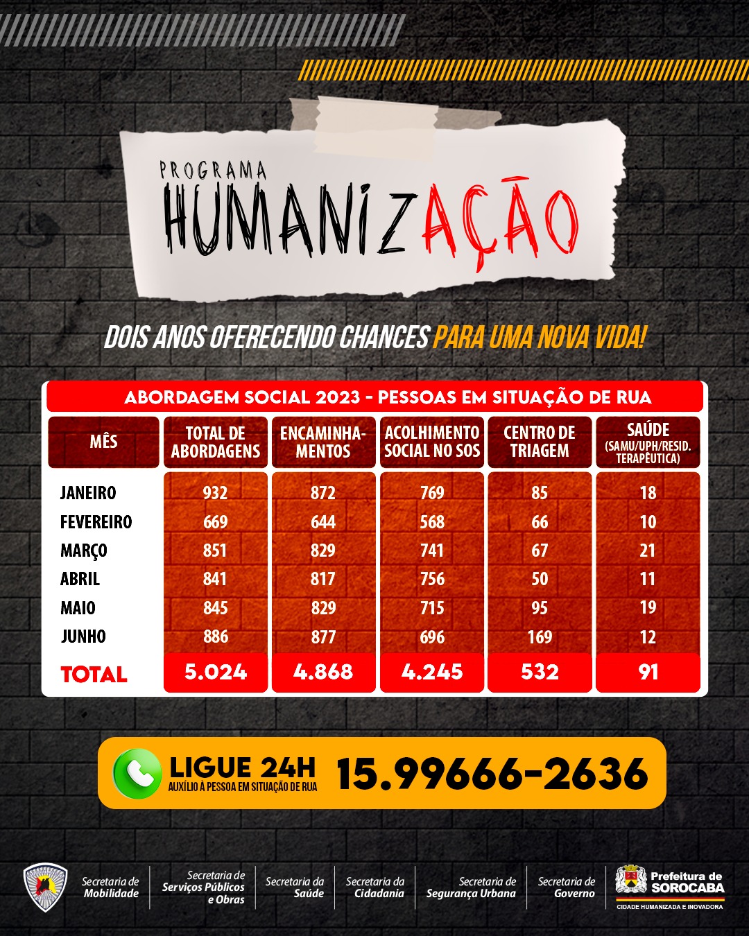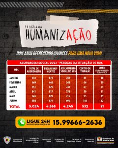 Somente em 2023 já foram realizados 5.024 abordagens sociais, que resultaram no total de 4.868 encaminhamentos aos serviços de assistência social e saúde proporcionados pelo programa, considerando que cada indivíduo pode receber mais de uma abordagem e mais de um encaminhamento, ao longo desse período.