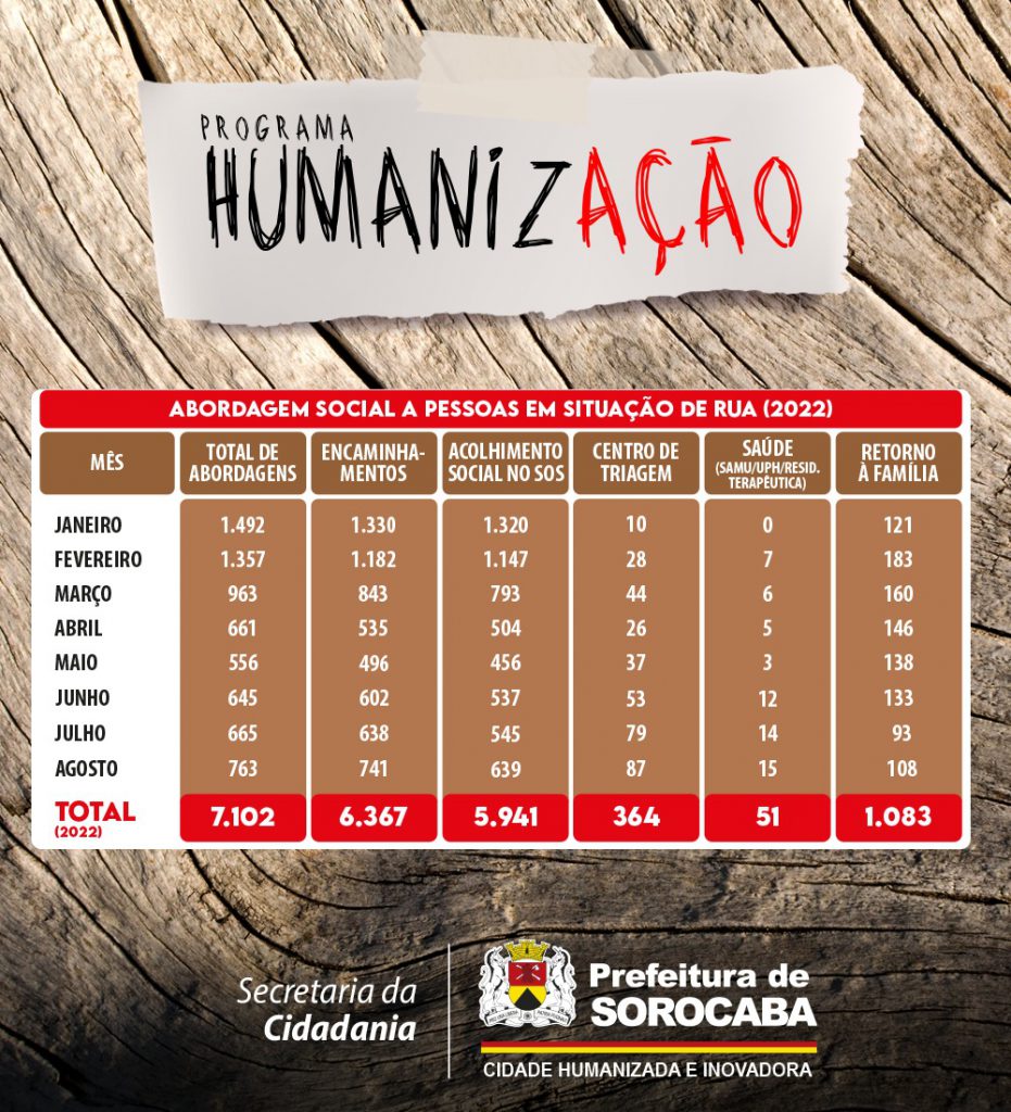 Entre janeiro e agosto deste ano, desse total, 364 pessoas foram encaminhadas ao Centro de Triagem; 51 receberam cuidados em saúde e mais de mil pessoas conseguiram retornar ao lar de origem, seja em Sorocaba ou em outras cidades de procedência. O retorno ao lar é providenciado pela Prefeitura de Sorocaba, sempre nas situações em que há o desejo da pessoa e a viabilidade para que isso aconteça.