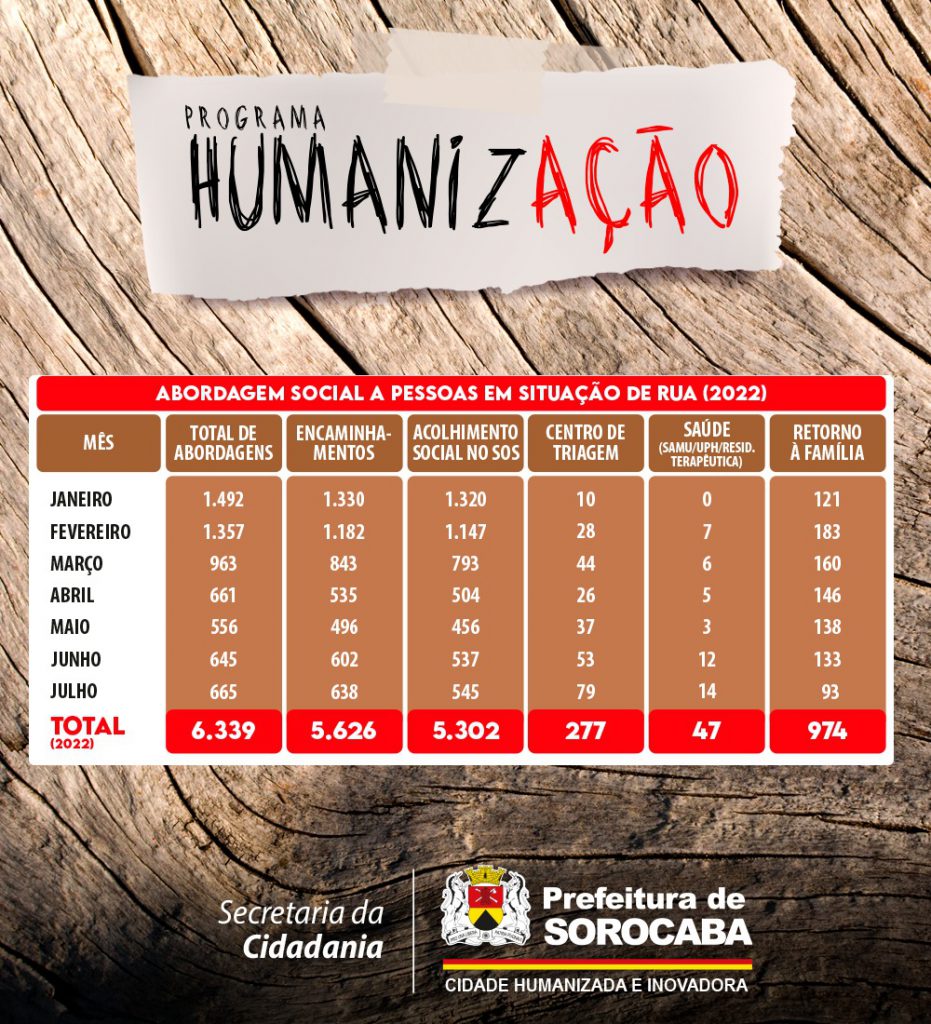 Desde o início deste ano até o fim do mês de julho, as equipes do programa “HumanizAção”, que atuam de domingo a domingo, com atendimento 24 horas, em todas as regiões da cidade, já realizaram 6.339 abordagens sociais especializadas a pessoas em situação de rua, sendo que esses atendimentos geraram 5.302 oportunidades de acolhimento no Serviço de Obras Sociais (SOS).