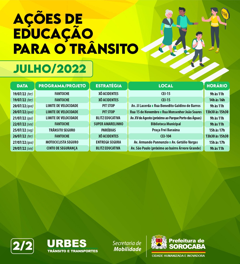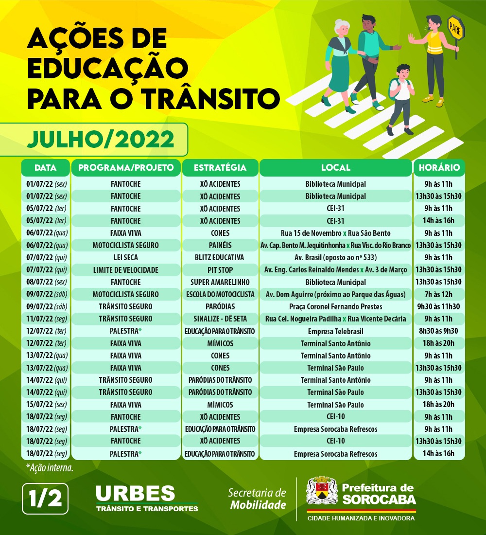 O calendário completo das ações educativas de trânsito da Semob, para o mês de julho, pode ser conferido nas mídias sociais da Prefeitura de Sorocaba (@prefeituradesorocaba). O agendamento de palestras e teatros, para agosto, pode ser feito pelo site da Urbes (https://www.urbes.com.br/), clicando em “Ouvidoria” e, depois, em “Educação para o Trânsito”. Navegando em “Abrir Manifestação”, é possível ter acesso ao formulário para preenchimento.