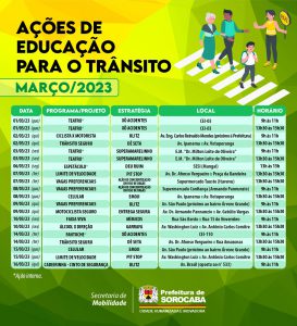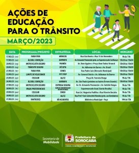 A Prefeitura de Sorocaba, por meio da Secretaria de Mobilidade (Semob), programou um calendário com 33 ações educativas de trânsito, para ocorrerem durante todo o mês de março, entre os dias 1 e 31/3. Ao todo, serão trabalhadas 16 temáticas diferentes, voltadas, tanto ao público infantil, quanto a adolescentes e adultos, sejam em escolas ou pontos estratégicos da cidade, todas elas gratuitas.