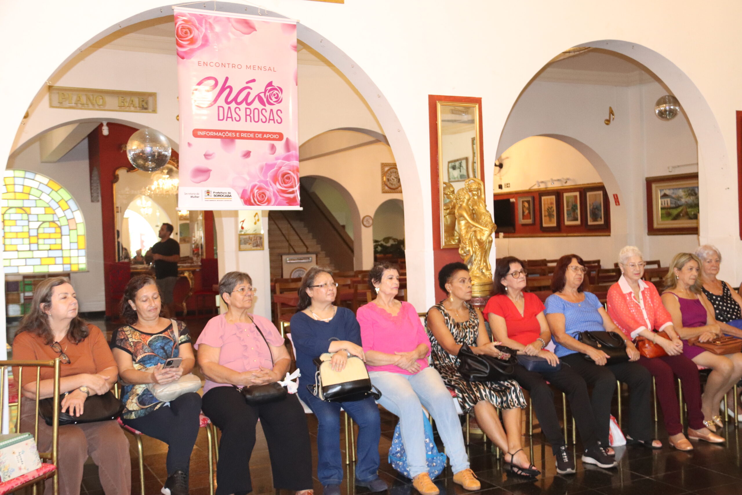 Em abril, o projeto Chá das Rosas, que proporciona um espaço de acolhimento e fortalecimento da autoestima para pacientes oncológicas está completando um ano em atividade e, para celebrar, a Secretaria da Mulher (Semul) preparou até um bolo especial, durante o lanche servido às participantes do encontro, nesta quarta-feira (29), no Sorocaba Clube. Trata-se de um endereço tradicional de Sorocaba, bem em frente a praça central, e o espaço tem sido gentilmente cedido para essa iniciativa, nos últimos meses. Participaram deste encontro a secretária da Mulher, Wanda Aparecida Oliveira, ao lado de outras integrantes da pasta, e também a nutricionista oncológica, Talita Urban, que palestrou sobre a importância da nutrição para pacientes oncológicas. Antes de sua fala, as visitantes puderam se encantar com a voz melodiosa da cantora Valdirene.